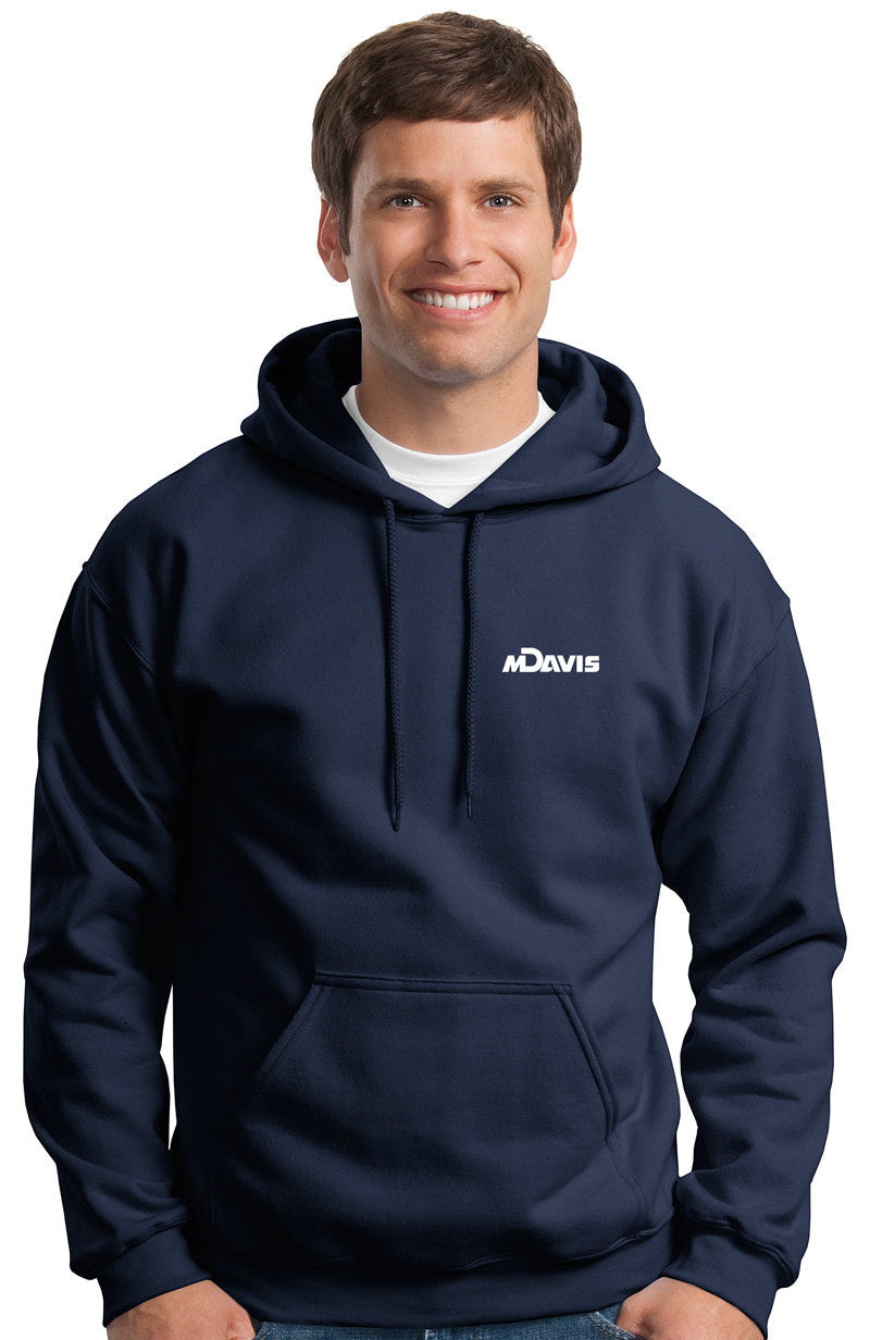 8 oz 50/50 cotton poly. Double-needle stitching at waistband and cuffs. Double-lined hood with dyed to match draw-cord. Front pouch pocket. Logo screen printed left chest and back of sweatshirt.